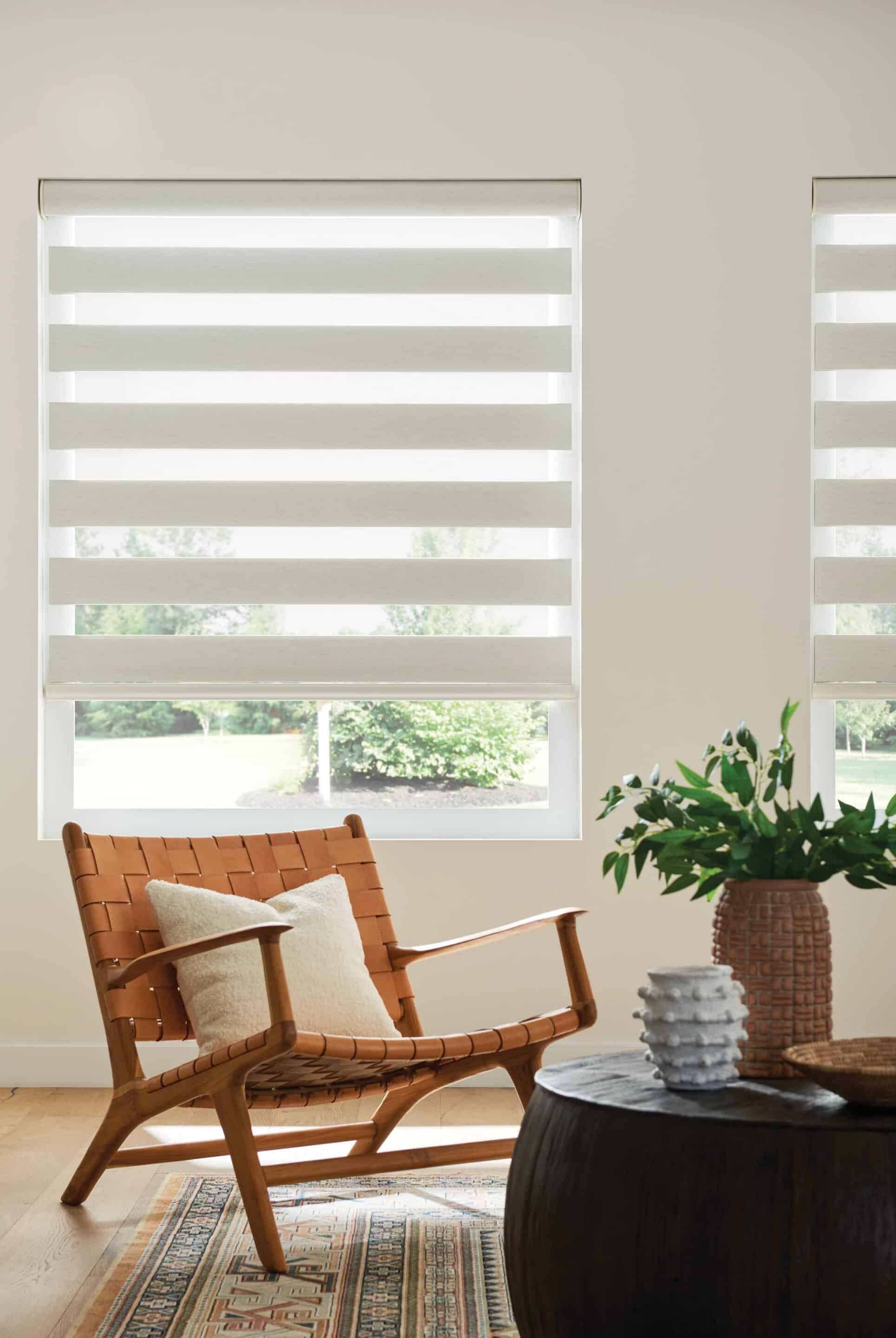 Dual Roller Shades have horizontal bands and can switch between sheer and solid, letting you control the amount of light and privacy. Their sleek and contemporary look makes them a popular choice for modern homes and they are beautiful for front curb appeal.